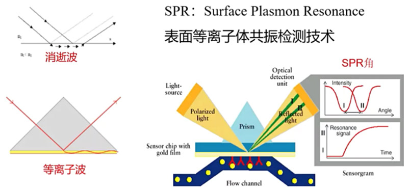 分子间相互作用强度和模式在药物研发中是衡量候选药物的重要指标。SPR芯片是一个带有葡聚糖(Dextran)的金属表面(Mental Surface),而配体蛋白(Ligand)的氨基端可以与葡聚糖结合从而被固定到金属表面。下方光源发出的一个单波长激光束进入到棱镜(Prism)中,导致多角度的光线入射到金属表面,几乎所有入射的光线都会发生反射,但有一个例外,在入射角达到某一个角度时,光子的能量会被金属吸收转化成表面等离子体波,在这个角度没有光线被反射出来,而是以很小的强度被检测器检测到,这个角度被称为共振角。由于等离子体波会在金属表面传播,所以金属表面偶联的配体蛋白与任何物质(这里固定的叫做配体ligand而流动相里面不是ligand叫做analyte)发生相互作用都将导致共振角发生改变。而共振角的该变量与Ligand-Analyte的数量成正比。因此,依据共振角的改变可以得到热力学的亲和常数Ka。