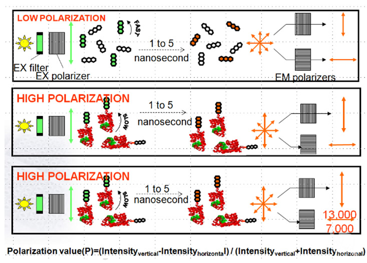 荧光偏振(FP)检测技术是一种以荧光标记的检测技术,它把荧光物质标记在特定物质上,使原本微弱的反应信号转化成较强的荧光信号,起到信号增强的作用。与此同时,在检测系统中加上起偏器和检偏器,当从光源发出的一束光线经垂直起偏器后成为垂直偏振光, 样品被垂直偏振光激发而产生偏振荧光, 此荧光经检偏器后可测出与样品浓度有关的水平或垂直方向的荧光偏振光强度。通过荧光强度和样品浓度制作工作曲线,可以进行定量分析,极大提高了方法的灵敏度和特异性。荧光偏振直接及时的检测示踪分子的结合 /自由率。荧光偏振实验在没有固相支持的溶液中进行,允许在低至皮摩尔级的范围内分析真实的平衡。荧光偏振检测并不掺杂样品,因此样品可以被再次处理并被重新分析用于评价 pH、温度和盐浓度改变对结合的影响。