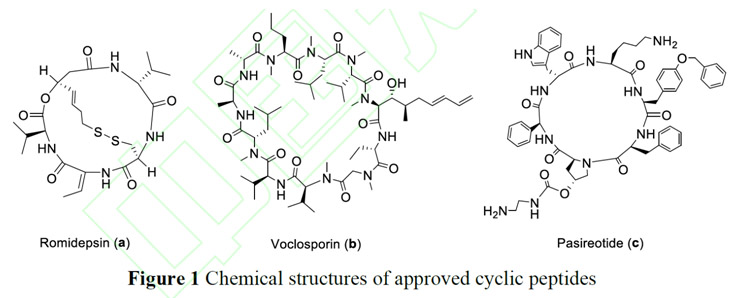 目前,已有不少的环肽药物应用于临床研究,例如从紫罗兰色杆菌中提取的罗米地辛(romidepsin,图1a),这种双环肽可以抑制组蛋白去乙酰化酶,临床上作为抗肿瘤药物用以治疗T 细胞淋巴瘤;从环孢菌素中分离提取的大环肽——伏环孢素(voclosporin,图1b),在2021 年被FDA 批准用于狼疮性肾炎(LN)的治疗;第二代生长抑素类似物帕西瑞肽(pasireotide,图1c),在临床上用于治疗手术无效的库欣病。